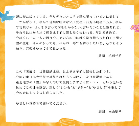 Tweet 旅団「雪解け(2011 remix)」 観る者を熱狂の渦へ巻き込む大所帯サイケデリックジャムバンド旅団。彼らがライブ会場限定でリリースした「雪解け」を被災地に早く豊かな春が来るようにと思いを込めリアレンジして配信開始。ステージではアグレッシヴな彼らの別の一面が垣間見える穏やかなナンバー。(by mitchel)Message From 旅団旅団 FILE TYPE : MP3(10:19)、JPG(Jacket) PRICE : 200円 300円 400円 500円 500円 600円 700円 800円 900円 1,000円 1,500円 2,000円 3,000円 4,000円 5,000円 8,000円 10,000円 20,000円 30,000円 40,000円 50,000円 100,000円 (tax in)