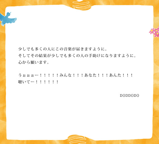 東京に居ていちばん悔しいことはDODDODOのライブをすぐ観に行けないことかもしれない。10代の頃に四国から上京して活動を続けて来た僕は、この同い年の驚くべきミュージシャンのことをずーっと知らずにいたのだ。不器用にそこらじゅうを抱きしめて回る歌とビート、でっかいハート。子供の頃、夕暮れの片隅で手を振って別れたままの優しい妖怪みたいに、初めて会ったとは思えない、懐かしい友達がそこに居た。ドッドド!(by七尾旅人)