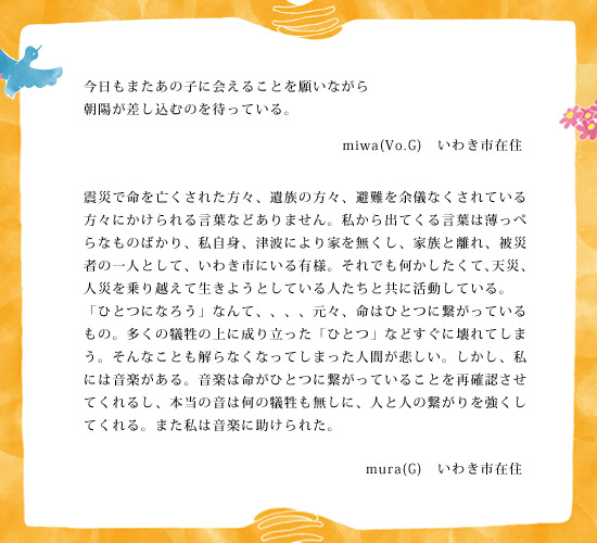 震災被害により漏電し休業を余儀なくされていた福島県いわき市のライブハウスsonicが4月9日、僕とユザーン、そして地元のミュージシャンたちをステージに上げ、再び音楽を鳴らし始めた。僕は「開放厳禁」と書かれた舞台袖のドアをこっそり開けて、ずっと彼らのライブを聴いていた。目が覚める思いだった。音楽、文化によって守られる人間の尊厳という事をこれほど身をもって感じた事はなかった。また必ず始められると思った。凛とした後ろ姿で歌を紡いで行くmiwaさん、そしてキュートな笑顔とイントネーションが忘れられない大工のおっちゃんムラシゲさんが爪弾くギター。打ち上げで呑み交わしてるうちに僕の鞄に入っていたCD-R「海辺のあしあと」、自分だけの宝物にしておくことは到底出来ず、御二人のお許しを得て、配信させて頂く事にした。本当の名盤です。(by七尾旅人)