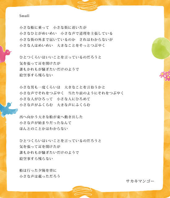 タンザニアやジンバブエ、マラウィーを訪ね歩き、親指ピアノを学びながらも、アフリカ音楽をそのまま再現するのではなく、常に自分だけの音楽を作り上げてきたサカキマンゴー。彼が率いるトランシー・ダブ・バンド「リンバ・トレイン・サウンド・システム」の第二作「オイ・リンバ」には、彼の生まれ故郷の言葉である「頴娃(えい)語」(鹿児島方言の一種)で歌われた歌がたっぷり収録されている。その中の一曲である、この「SMALL」は中東反政府デモや3.11東日本大震災、そしてその後の反原発デモを経て、急遽作り上げ、既に完成していたアルバムに追加収録されることとなった。「頴娃(えい)語」の歌と親指ピアノの優しい音色から伝わってくるのは哀悼だろうか?サウダージだろうか? 聞き取れそうで聞き取れない言葉の向こう側に広がる風景を想像したくなる。(by サラーム海上)